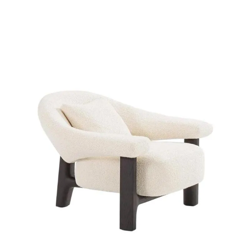 A cocoon-inspired armchair with soft sculptural curves, a solid wood base, and plush textured upholstery—offering ergonomic comfort with a warm, refined presence.