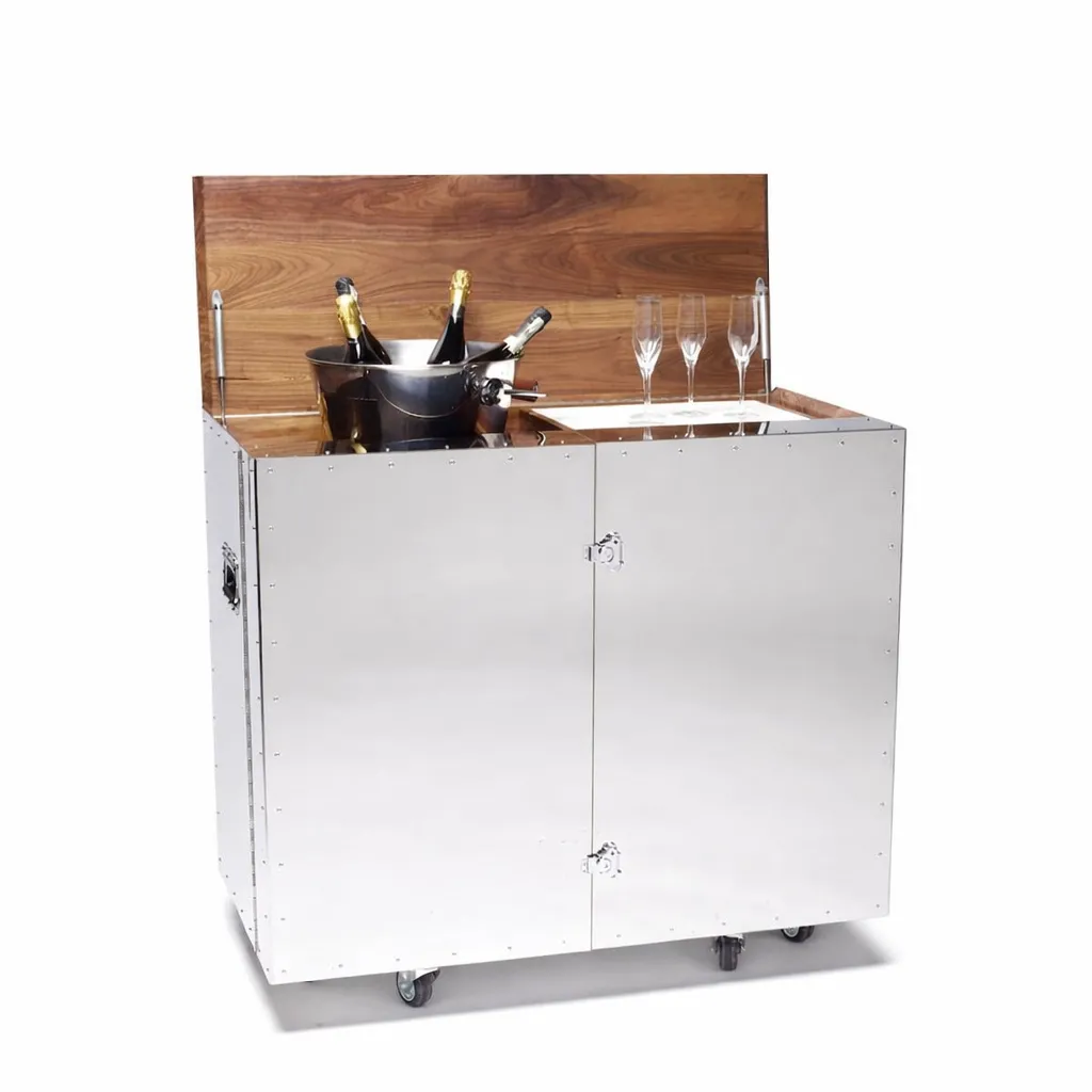 A mobile bar inspired by container design, crafted from mirror-polished stainless steel and walnut. Opens to reveal a fully functional bar with a sleek, refined finish.