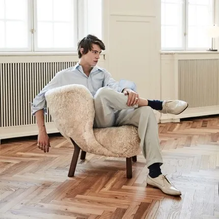 Single Sofa Chair Vintage Wabi Sabi Style Solid Wood Frame with Mohair Upholstery Designer Piece for Living Room and Balcony