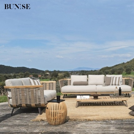 BUNISE Nordic Outdoor Wooden Sofa Set P37 - Designer Rattan Chairs with Coffee Table for Patios, Gardens, and Resorts