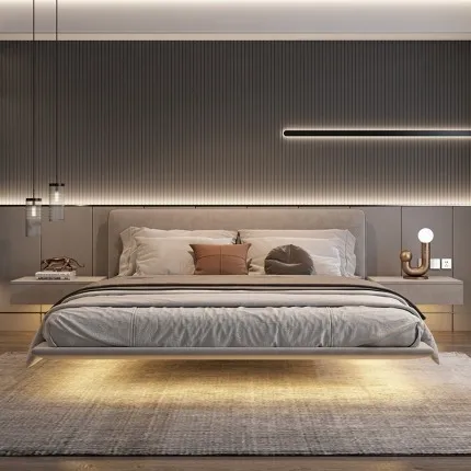 Minimalist Floating Fabric Bed with Solid Wood Frame Tech-Fabric Upholstery Wabi-Sabi Style for Master Bedroom or Villa