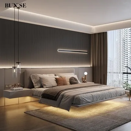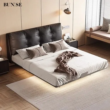 Italian Minimalist Floating Leather Bed Black Designer Style with Solid Wood Frame for Master Bedroom or Luxury Villa