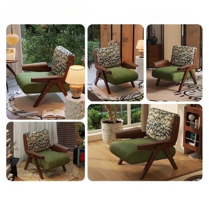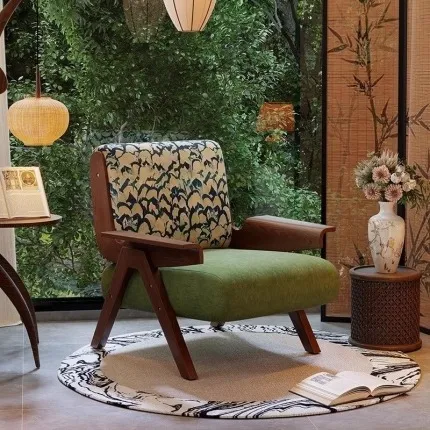 French Style Single Lounge Chair for Living Room and Balcony, Retro Luxury Design with Wooden Legs, Lazy Sofa