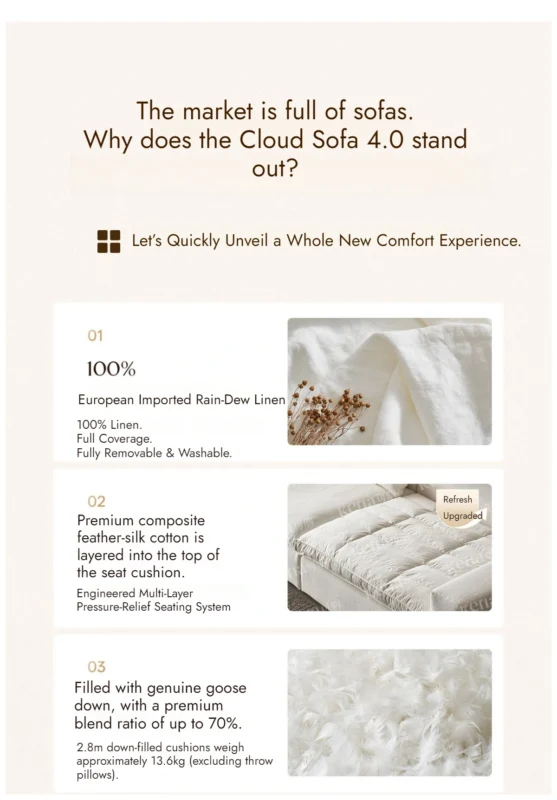 Weight of Quality: We don’t skimp on support. With over 13kg of premium goose down filling in every 2.8m unit, it’s not just a sofa—it’s a recovery zone for your home.