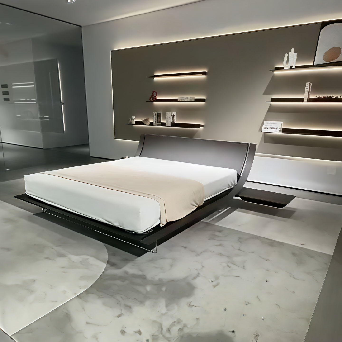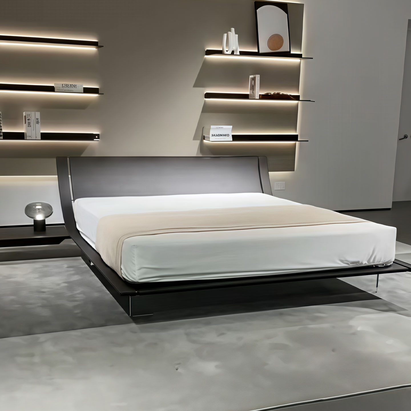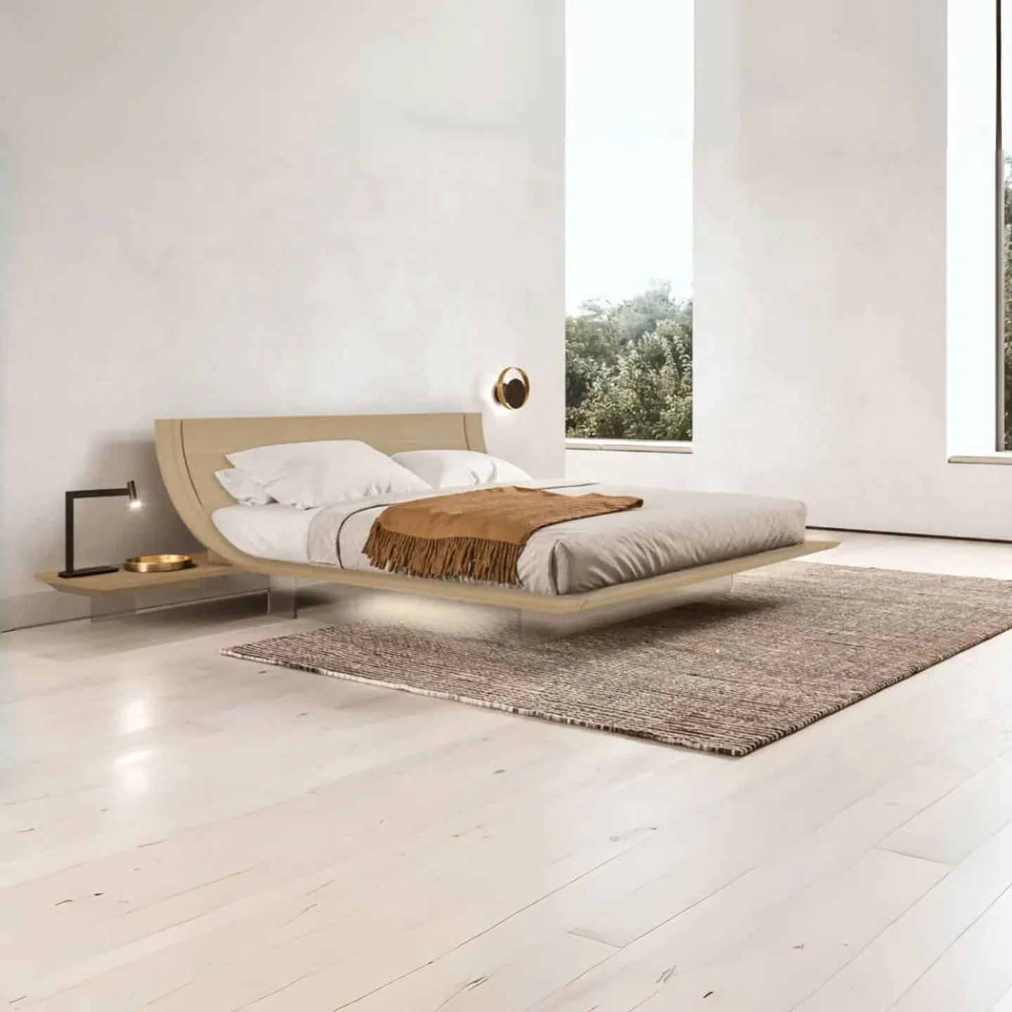 Italian Style Solid Wood Double Bed Modern Floating Frame Luxury Curved Design with Sensor Lighting Ideal for Villa and Master Bedroom