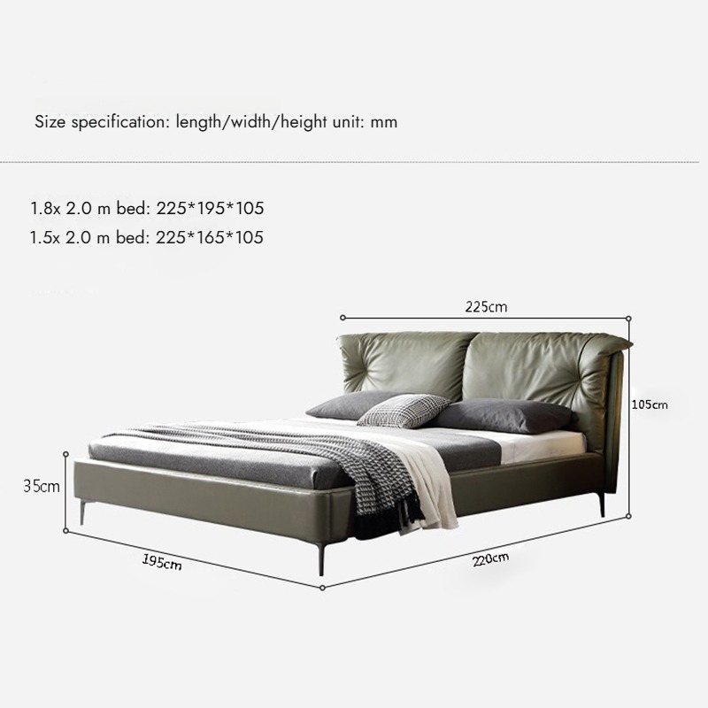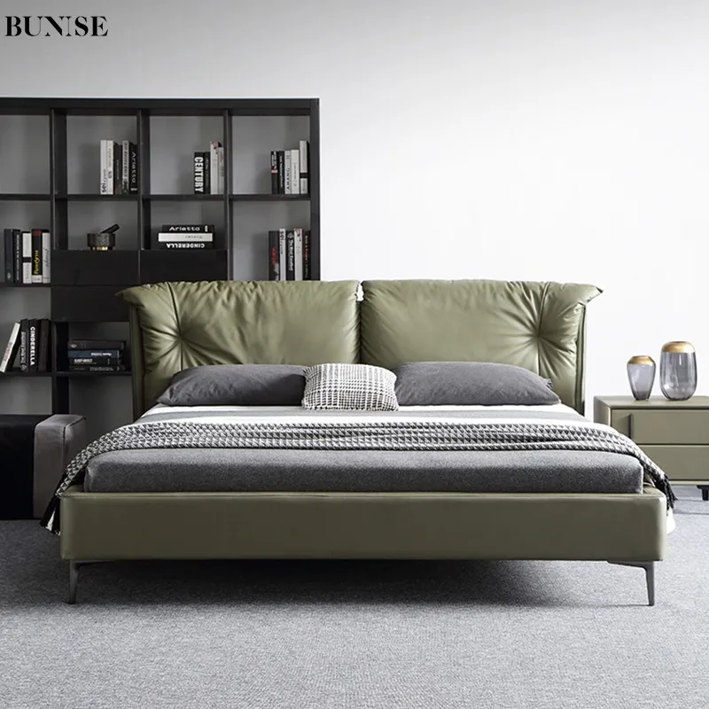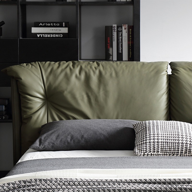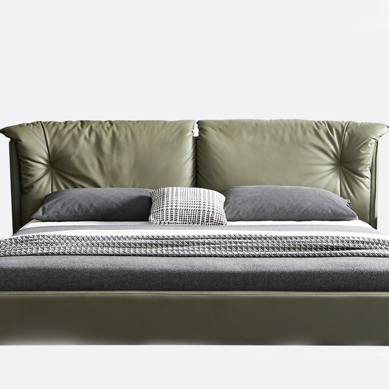 Genuine Leather Double Bed Down Feather Upholstered Headboard Dark Green Italian Minimalist Modern Style for Master Bedroom and Wedding Bed