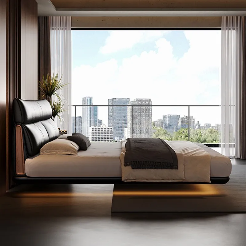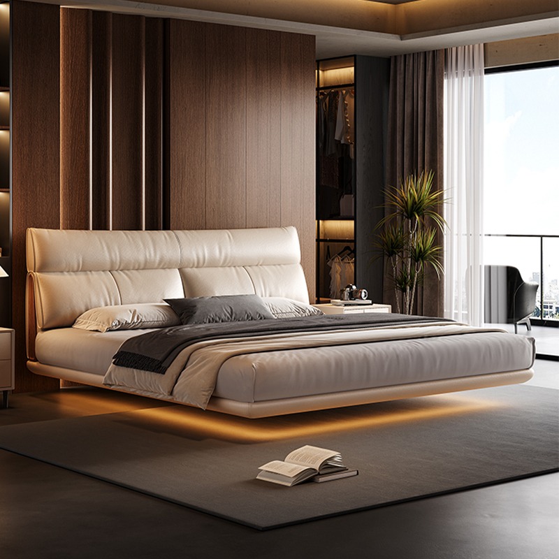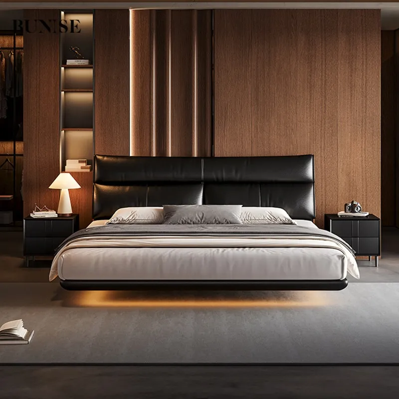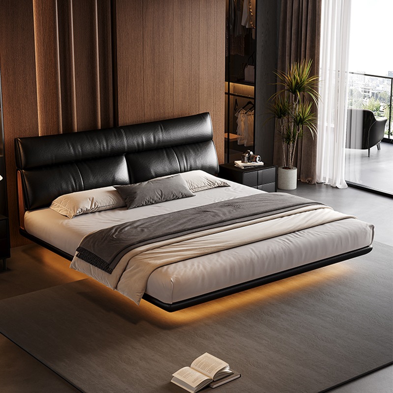 Modern Double Bed Carbon Steel Floating Frame with Genuine Leather Headboard Minimalist Style Ideal for Master Bedroom
