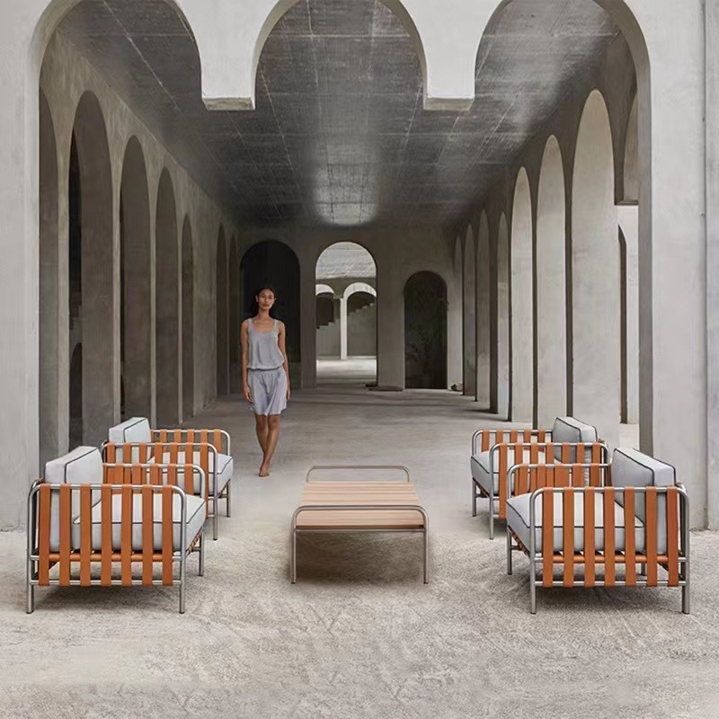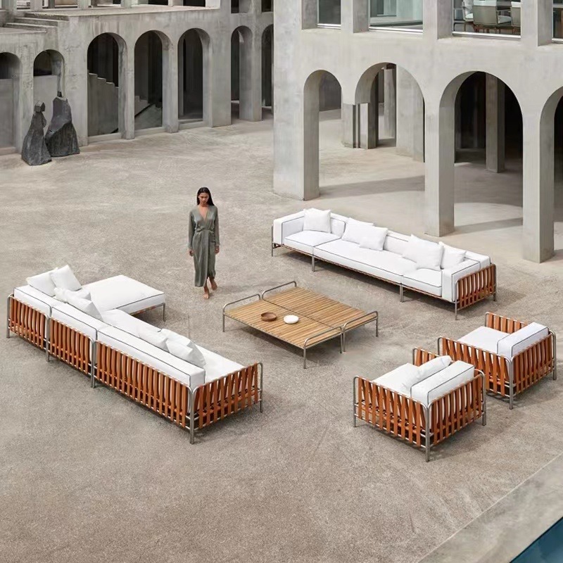 Outdoor Rattan and Teak Sofa Set Designer Style for Garden Balcony and Luxury Villa Waterproof Sun Resistant Ideal for Hotel and Homestay