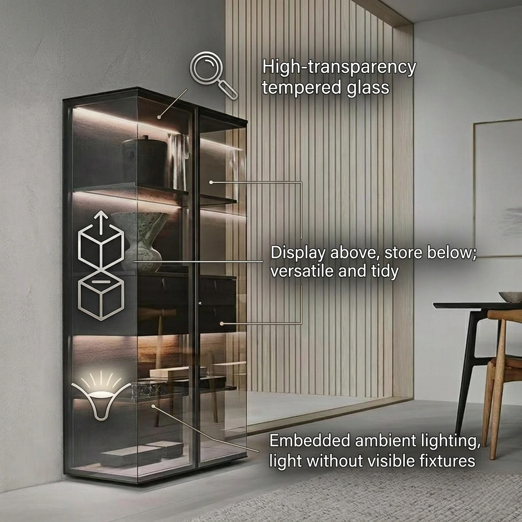 Sophisticated Minimalism with Integrated Lighting. More than just storage, the built-in LED system transforms your collection into a gallery-worthy display. The 3C certified tempered glass offers crystal-clear visibility while adding a sleek, modern touch to your living space.