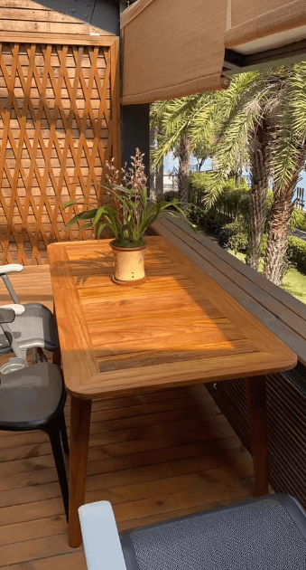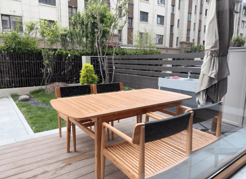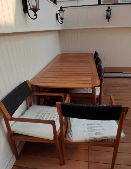 The teak tabletop is very sturdy, the chair seat is high and practical, and the price/performance ratio is very high