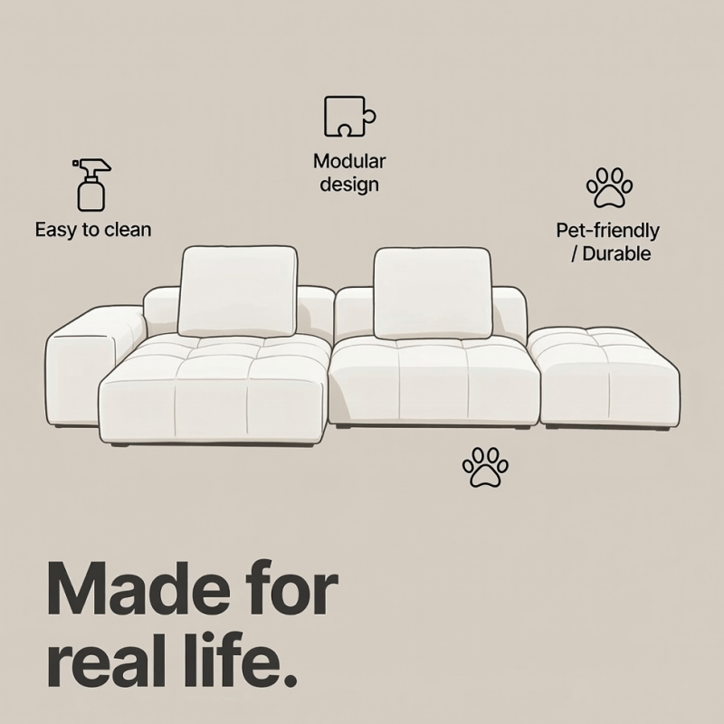 The Pixel Modular Sofa is a flexible, “Lego-like” sectional designed specifically for Bangkok condo living, featuring breathable fabrics and a space-saving layout that adapts to any home.