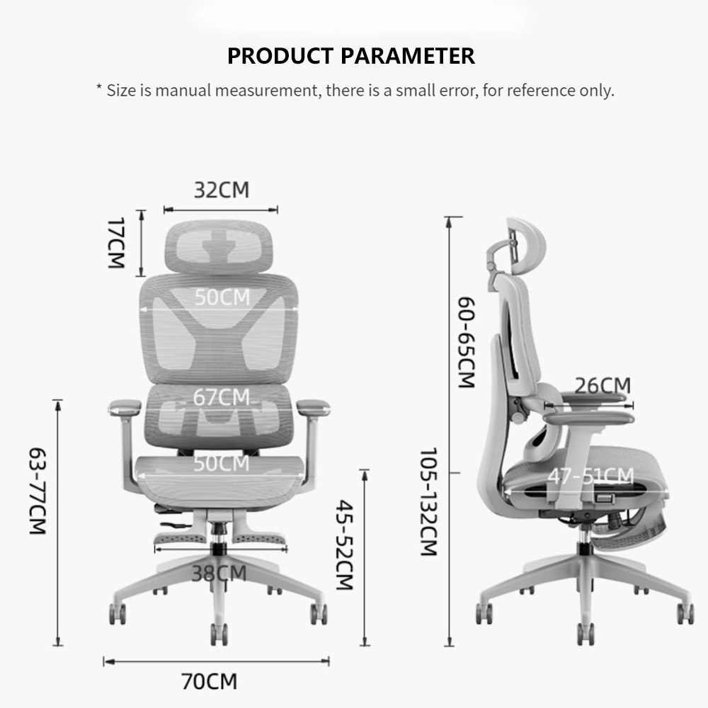 • Chair Backrest: The backrest is also made of PA material with a strong and durable mesh fabric cover, adjustable in height, and includes a lumbar support mesh.