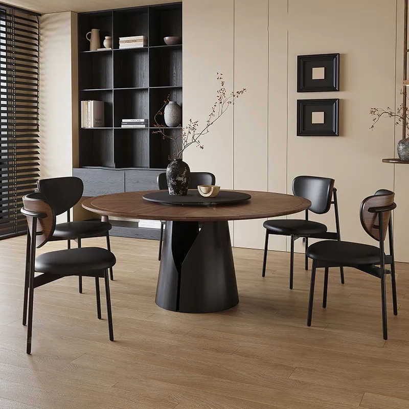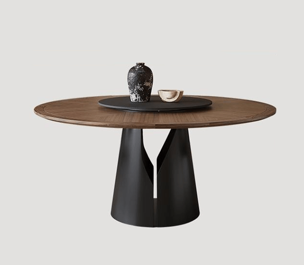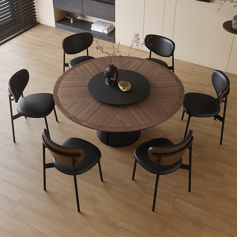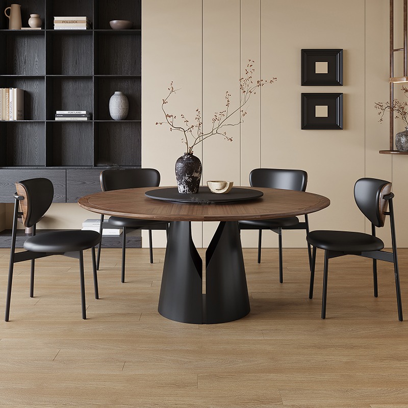 This round dining table, blending ancient-style wood grain with French rock slab, is a stunning fusion of elegance and simplicity!