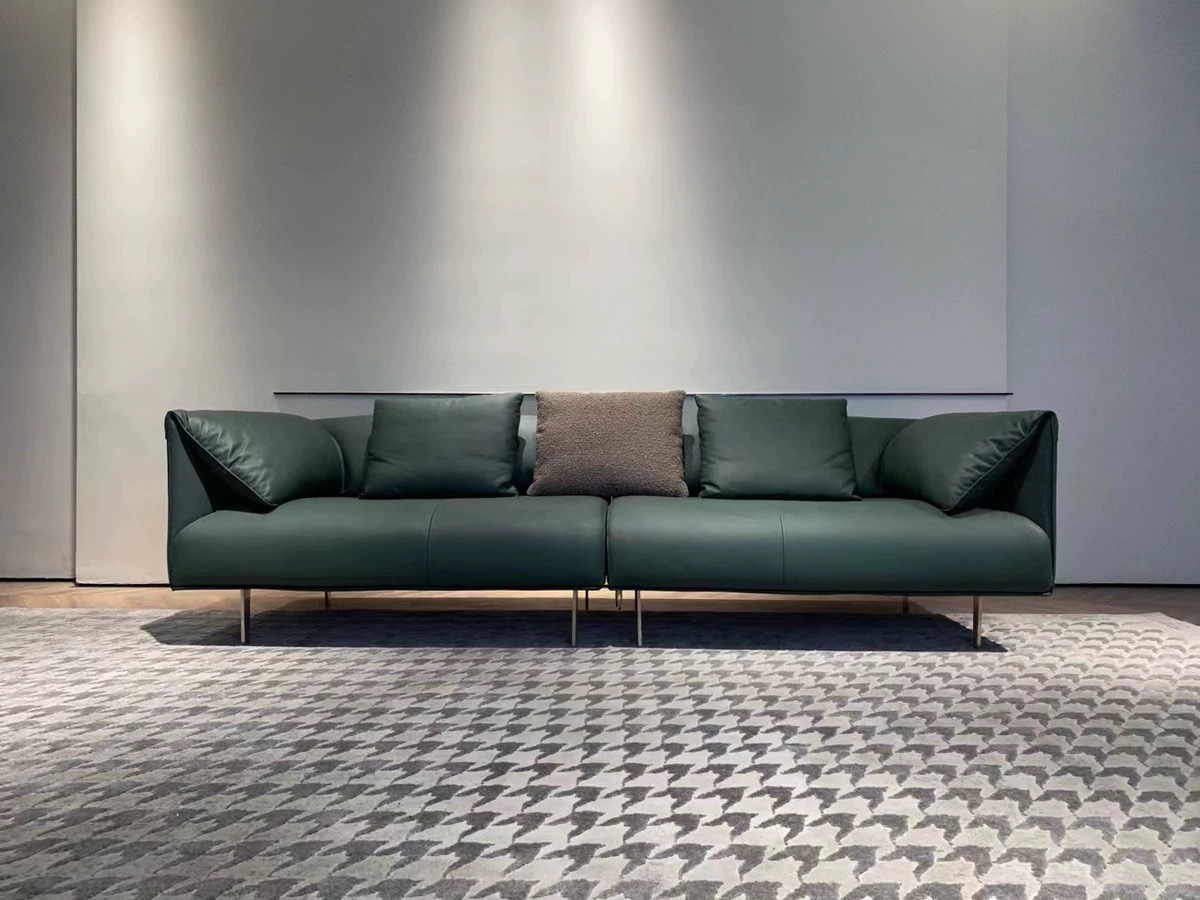 Genuine Leather Double Bed Down Feather Upholstered Headboard Dark Green Italian Minimalist Modern Style for Master Bedroom and Wedding Bed